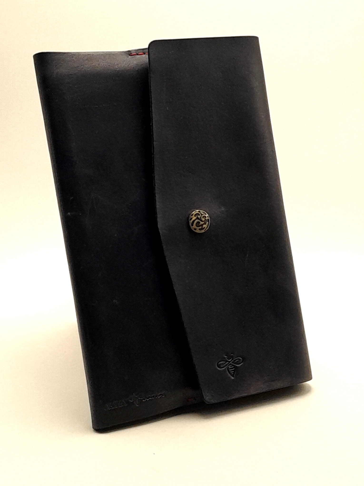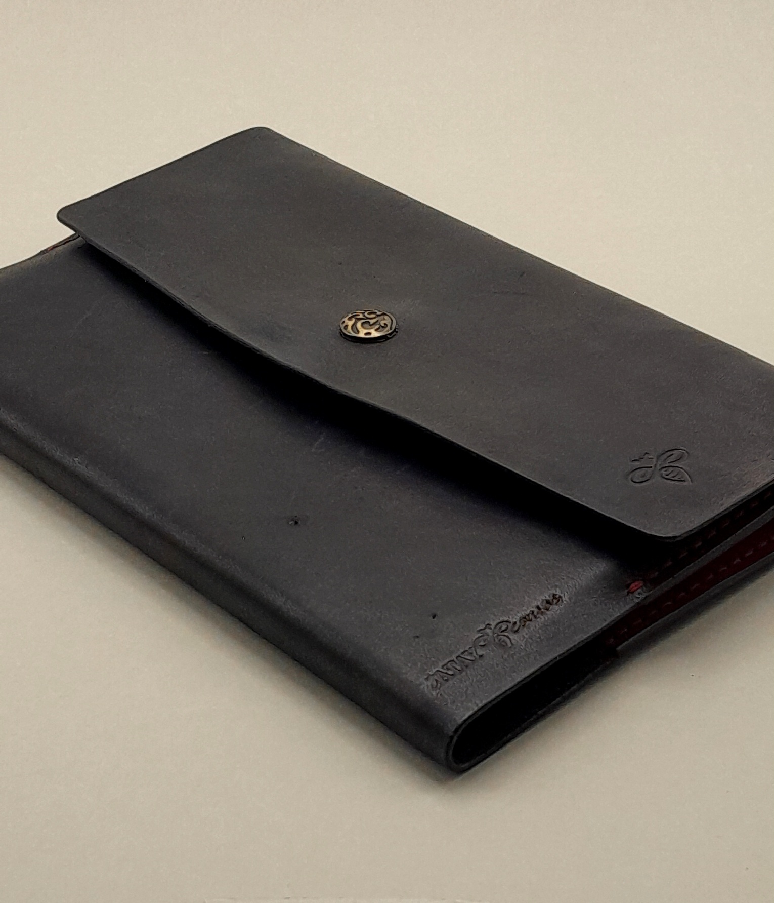 Capa para caderno tipo moleskine 21 X 14 cm em couro atanado de 20\ 22 linhas com fechamento por botão de pressão.