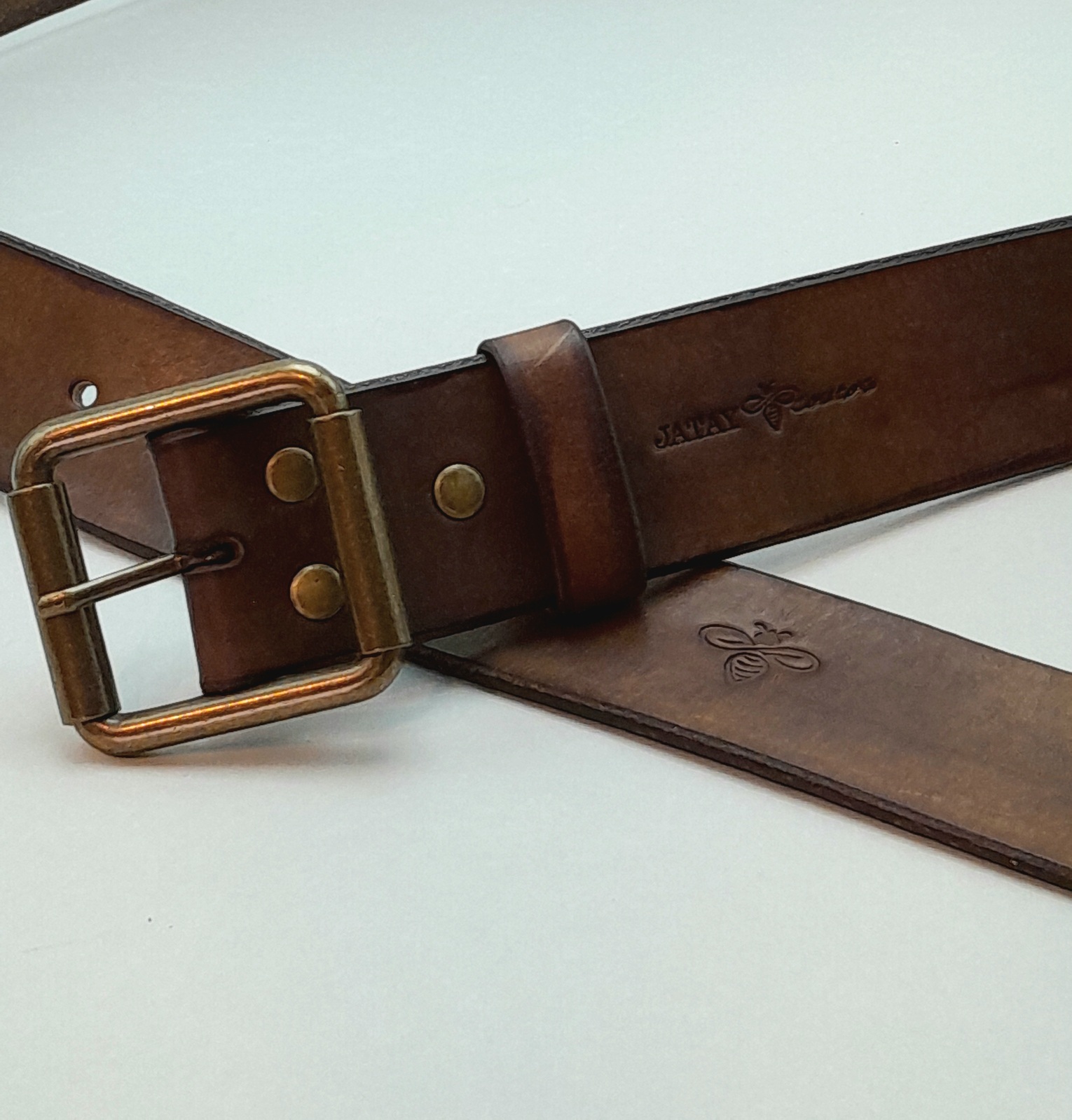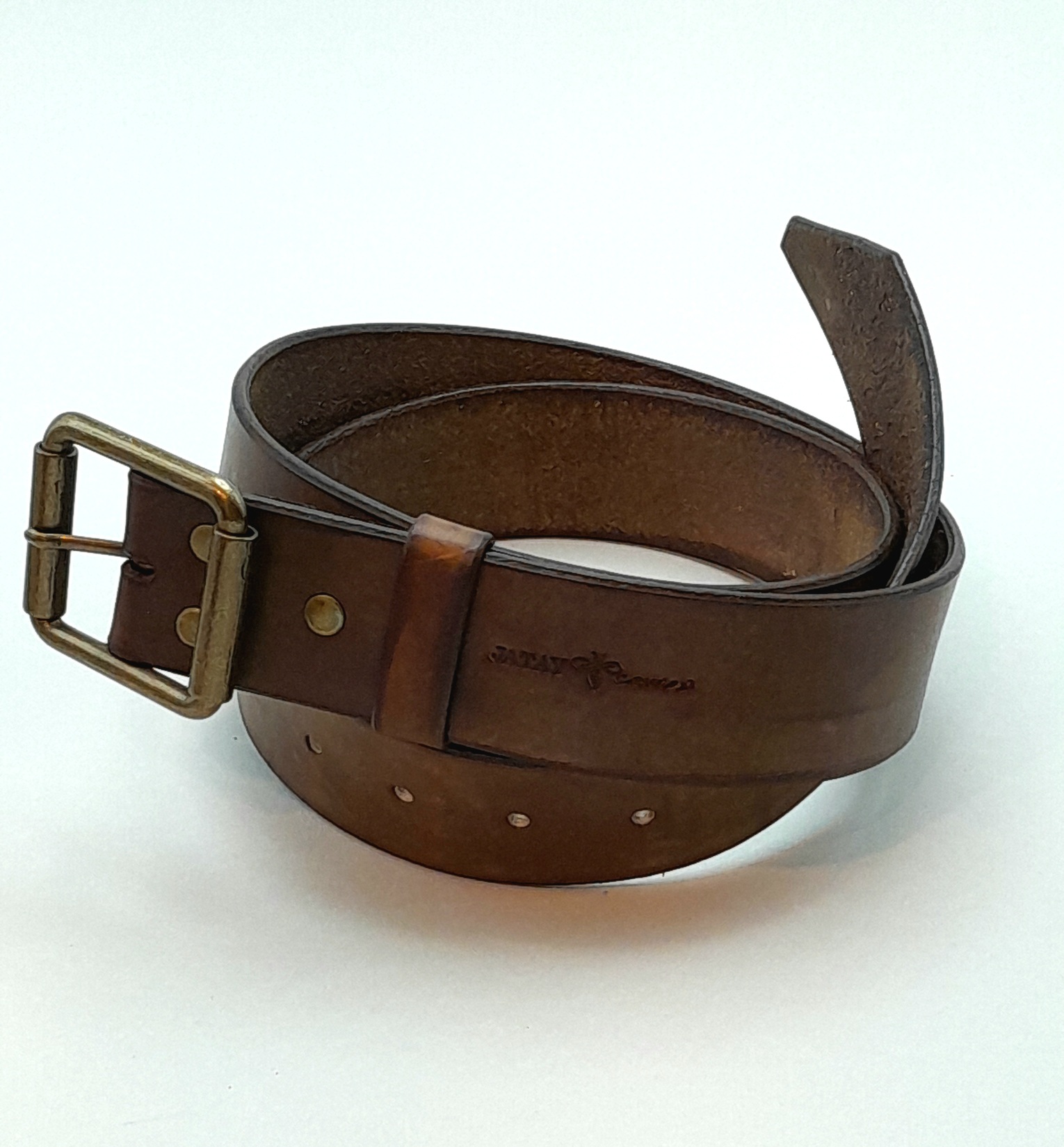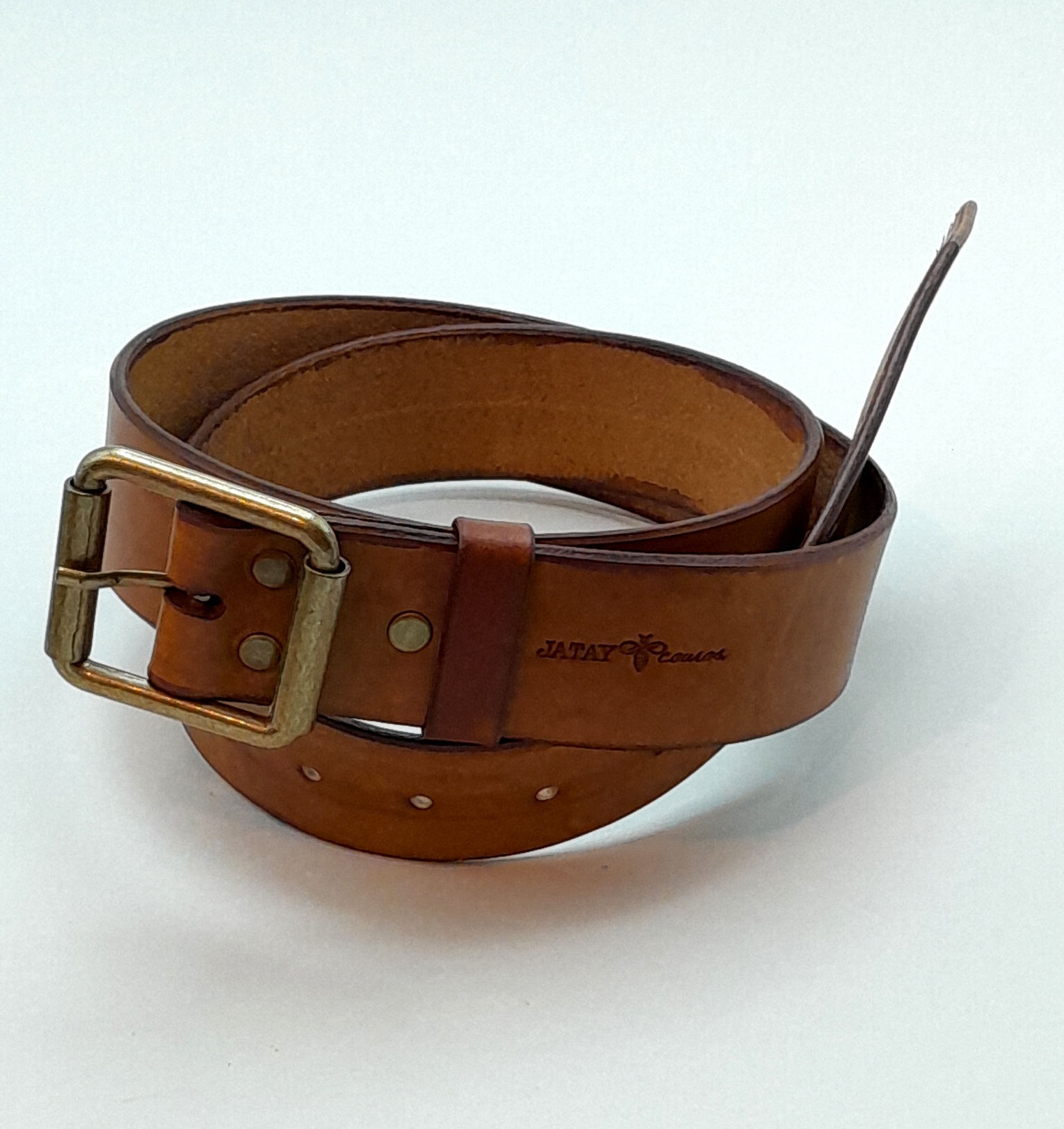 Confeccionado em couro bovino atanado de 35 linhas na espessura e 4 cm na largura. Fivela dupla com roletes na cor ouro velho fosco. Bordas inteiramente brunidas manualmente.