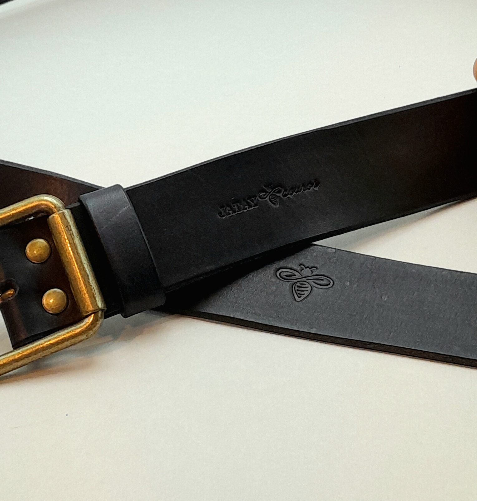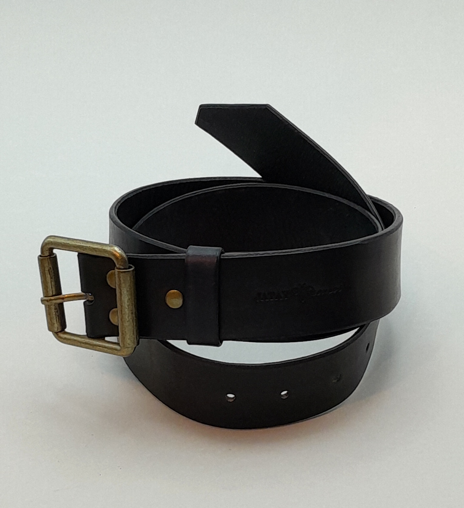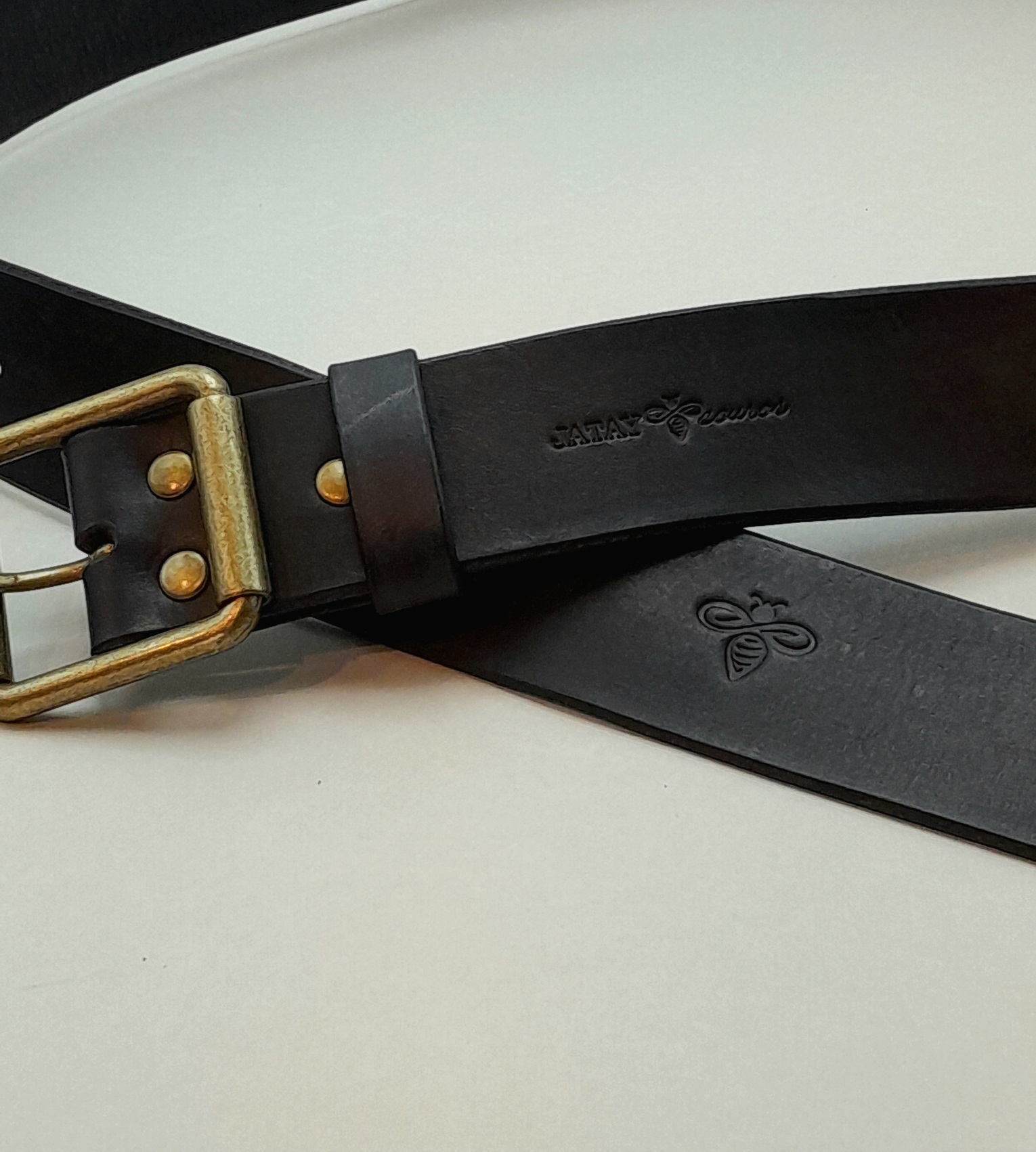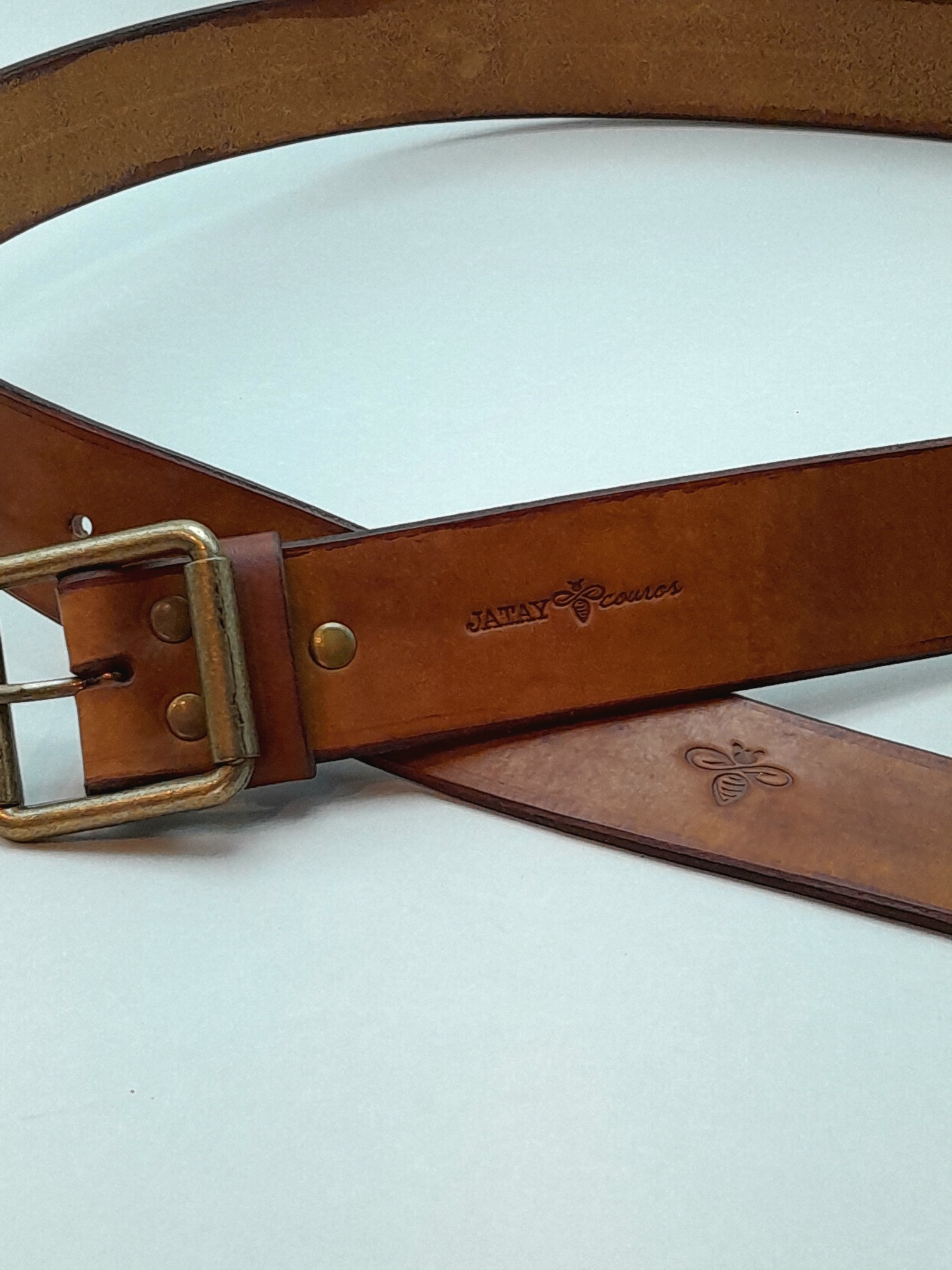 Confeccionado em couro bovino atanado de 35 linhas na espessura e 4 cm na largura. Fivela dupla com roletes na cor ouro velho fosco. Bordas inteiramente brunidas manualmente.