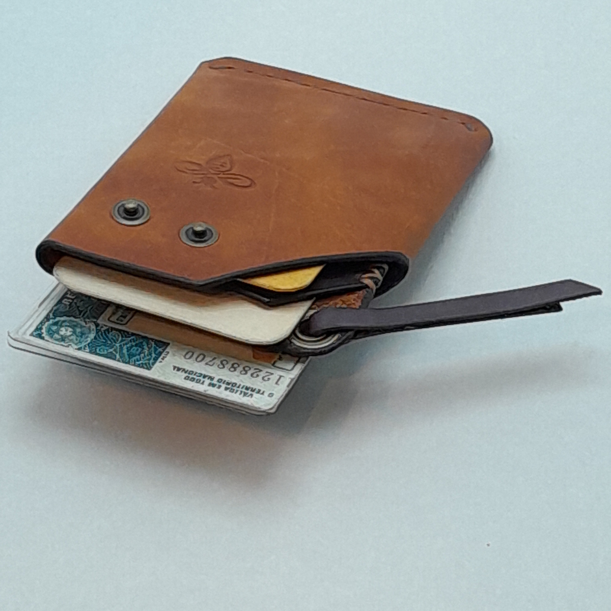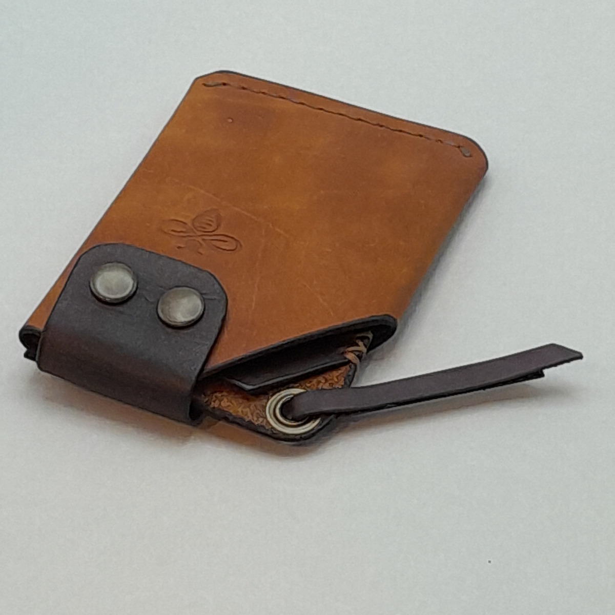 Prático e funcional, Confeccionado em couro bovino atanado de 1.8/2.0 linhas. Cortada, tingida e costurada a mão. Costura reta e bordas brunidas manualmente.